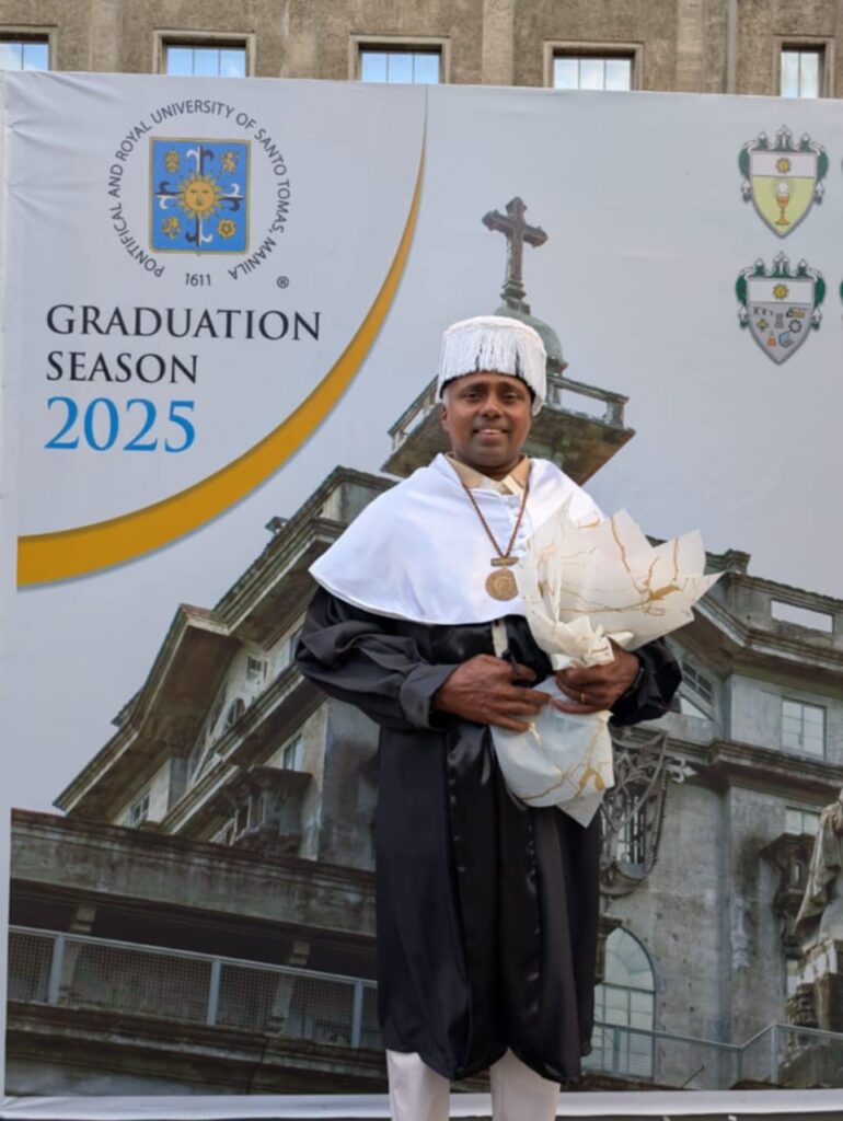Fr. Edgar Martinez, OFMCap, warmly congratulates our brother, Fr. Sebastian Mittathanickal, OFMCap, on his remarkable achievement. On June 14, 2025, Fr. Sebastian graduated cum laude and was honored with the prestigious Albertus Magnus Award at the Pontifical University of Santo Tomas. Currently serving as Chaplain at De los Santos Medical Center in Quezon City, Fr. Sebastian exemplifies the Franciscan spirit through his dedication to both intellectual excellence and pastoral care.